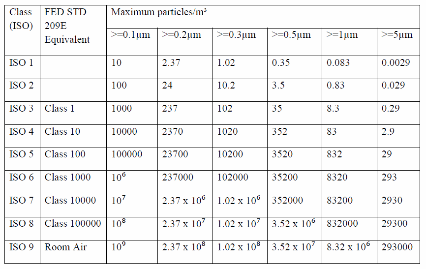 國(guó)際標(biāo)準(zhǔn)組織建立了九個(gè)潔凈室分類(lèi)。這些標(biāo)準(zhǔn)被分配了從 ISO 1 到 ISO 9的分類(lèi)。潔凈室分類(lèi)基于房間的清潔度。這些分類(lèi)被分解為每立方米有多少特定尺寸的顆粒,然后被分配一個(gè) ISO 分類(lèi)。然后根據(jù) ISO 標(biāo)準(zhǔn)分配類(lèi)。不同的行業(yè)需要不同的清潔度和無(wú)菌度。